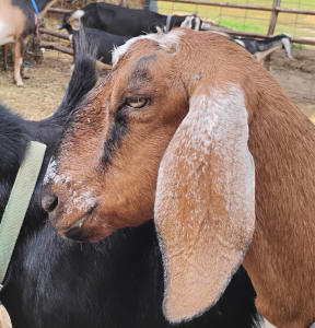 Swan is as graceful as her namesake. She is long bodied with a long bone pattern throughout and has super long, wide ears. She also has an incredible roman nose. She also has some of the best udders in the MiniNubian world behind her as well as heavy milkers with high butterfat (her dam was top 10 for butterfat in 2020 and aunt, Penny Candy, was top ten for BF in 2024). Swan's udder is incredible! Her udder texture is buttery soft, teats are well placed, perfectly sized with great orifices. Her capacity and production is AMAZING. Her udder shape is great. Foreudder is wide, deep and well extended. Rear udder height is good and very wide. Medial is very nice as well. I am thrilled with her udder! She also puts everything into the milk pail.