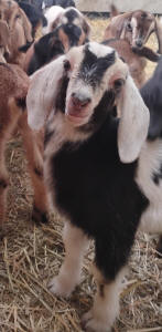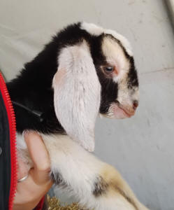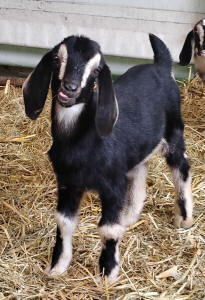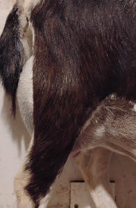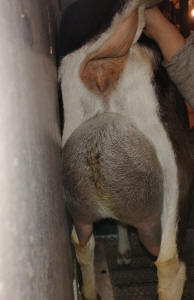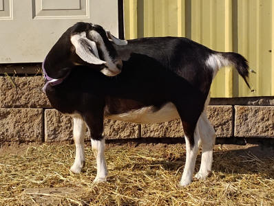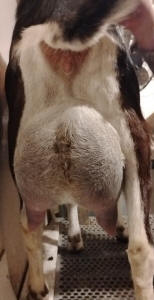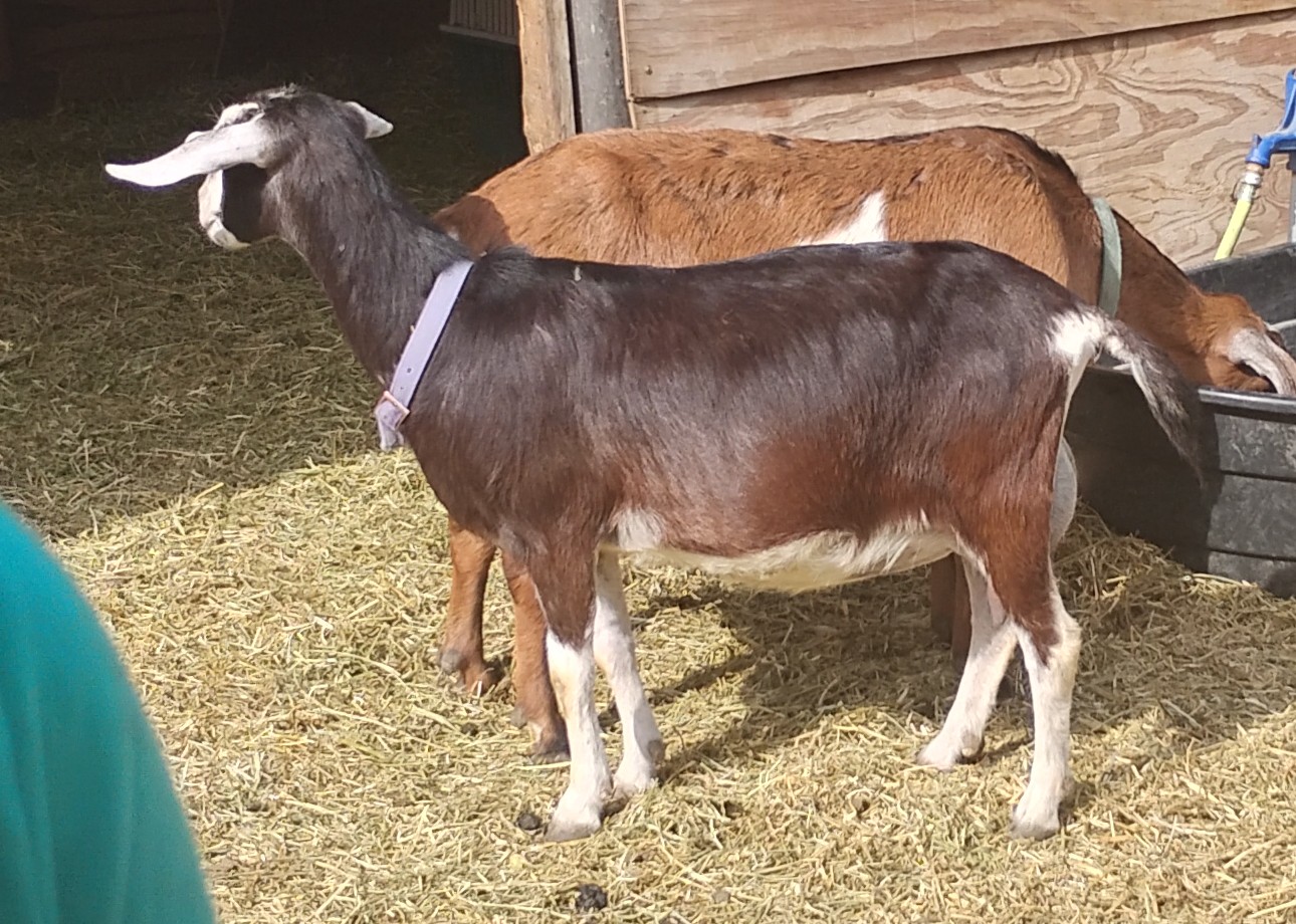 I am very excited about this little doe. She is out of the new doe we brought in (Skillmans Andromeda *P) who has super udder and milk genetics behind her. Swiss' sire is one of our favorites, Cal. Swiss has gorgeous conformation with a loooooong body, nice feet and legs, a level topline, a strong brisket, excellent width. Her breed character is her weakness, but still a massive improvement over her dam. Swiss' udder did not disappoint! It is SOCKED on tight, with perfectly sized teats and good production. On an unimportant note, her coloring is fun as I have always wanted a swiss marked doe (she's a swiss/sundgau combo) and she is also a very dark chocolate.